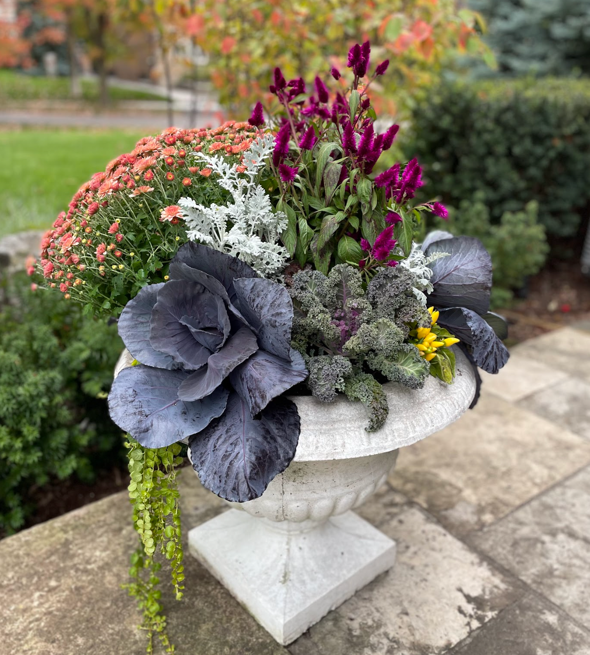 When the air grows crisp we start to think about feathery fountain grass, crisp cabbages, fragrant ornamental sage, and the vibrant colours of mums, asters and celosia.